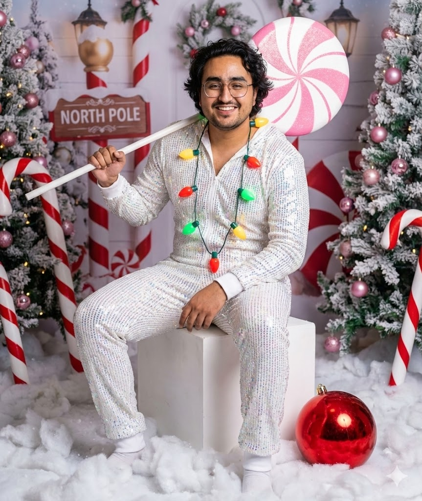 Use his real facial features exactly as they are — do NOT change, enhance, or alter his face in any way. His look is clean and festive, with natural skin texture and a confident, cheerful expression.